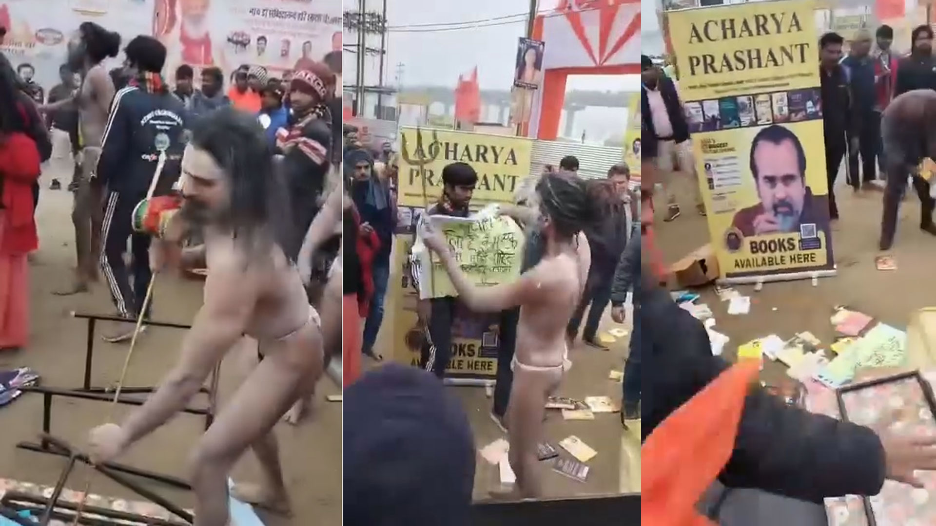 మహా కుంభమేళా ప్రాంతంలో మన మహా కుంభమేళా ఒక బూటకమని పోస్టర్లు పట్టుకుని యువతీ,యువకులు ప్రదర్శించారు. వీటికి సంబంధించిన పుస్తకాల పంపిణీ చేయటం ఆరంభించారు. అటుగా వెళుతున్న నాగ సాధువులు కంట ఈ దృశ్యం పడింది.