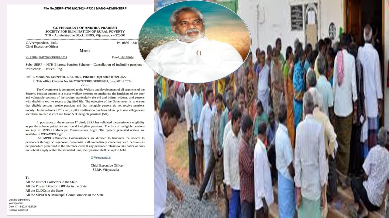 ఇదిలా ఉండగా ప్రస్తుతం పించన్లు పొందున్న వారిలో ఐదు శాతం అనర్హులు ఉన్నట్లు కూటమి ప్రభుత్వం గుర్తించింది. ఇటీవల ప్రతి జిల్లాలో ఒక వార్డు, ఒక సచివాలయం పరిధిలో చేసిన పైలట్ సర్వేలో 563 మంది పించను లబ్దిదారులు అనర్హులుగా లెక్కతేల్చారు. వీరందిరికీ నోటీసులు ఇవ్వమని ఎంపీడీఓలు, మున్సిపల్ కమీషనర్లను సెర్స్ సీఈఓ జీ.వీరపాండ్యన్ ఆదేశాలు జారీ చేశారు. అనర్హుడైన ఏ పించనుదారుడైనా ఈ నోటీసులు తీసుకోవడానికి నిరాకరించినా, నిర్ణీత గడువులోపలు సమాధానం ఇవ్వకపోయినా తక్షణం అతని పించను హోల్డ్ లో పెట్టాలని ఆదేశించారు. ఒకవేళ సదరు పించనుదారుడు అనర్హుడని తేలితే వెంటనే అతని పించను రద్దు చేయాలని సెర్ప్ సీఈఓ సూచించారు. పైలట్ సర్వేలోనే 563 మంది దొరికితే ఉత్తరోత్తరా రాష్ట్రంలో పూర్తి స్ధాయిలో సామాజిక పించన్లపై సర్వే నిర్వహించి ఎన్ని లక్షల మందిని అనర్హుల సాకుతో తప్పిస్తారో అని వైఎస్సార్సీపీ ఆందోళన వ్యక్తం చేస్తోంది.
