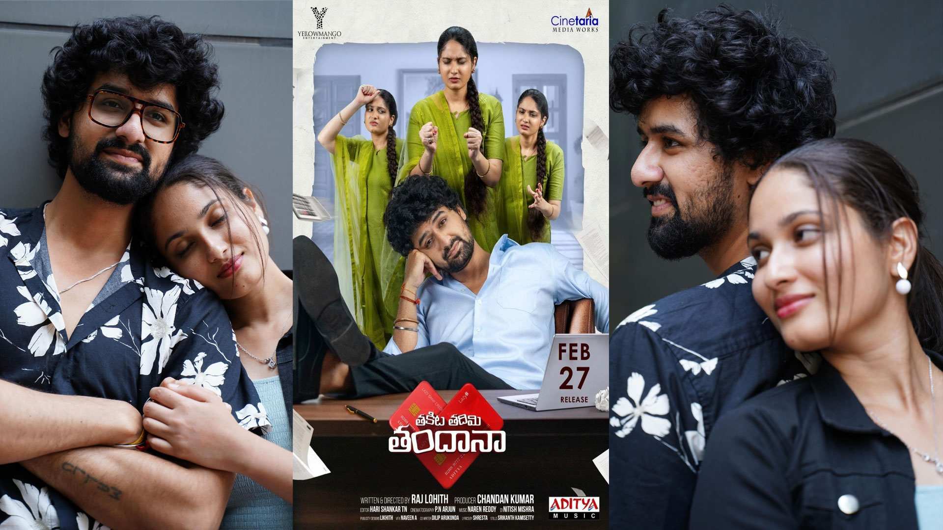 “మర్డర్” ఫేమ్ ఘన ఆదిత్య – కొత్తమ్మాయి ప్రియ జంటగా.. యువ ప్రతిభాశాలి రాజ్ లోహిత్ దర్శకత్వంలో ఎల్లో మ్యాంగో ఎంటర్టైన్మెంట్ పతాకంపై.. చందన్ కుమార్ కొప్పుల నిర్మించిన “తకిట తదిమి తందాన” చిత్రం అన్ని కార్యక్రమాలు పూర్తి చేసుకుని, ఈనెల 27న ప్రేక్షకుల ముందుకు రానుంది. ఈ చిత్రం సినెటేరియా మీడియా వర్క్స్ ఆధ్వర్యంలో విడుదల కానుంది. ఈ చిత్రానికి పి.ఆర్.ఓ: ధీరజ్-అప్పాజీ, సంగీతం: నరేన్ రెడ్డి, ఎడిటర్: హరి శంకర్, సినిమాటోగ్రఫీ: పి.ఎన్.అంజన్, లిరిక్స్: శ్రేష్ట, కో-రైటర్: దిలీప్ అరుకొండ!!