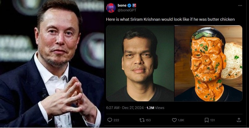ఈ క్రమంలోనే ఓ ఇంటర్నెట్‌ యూజర్‌ తన ఎక్స్‌ ఖాతాలో శ్రీరామ్‌కృష్ణన్‌కు సంబంధించి అభ్యంతరకరమైన ఫోటోను షేర్‌ చేశాడు. అంతేకాదు.. జాత్యహంకారంతో కూడిన కామెంట్‌ చేశాడు. శ్రీరామ్‌కృష్ణన్‌ ముఖానికి బటర్‌ చికెన్‌ పూసినట్లు ఏఐలో ఇమేజ్‌ క్రియేట్‌ చేసి ఓపక్కన శ్రీరామ్‌కృష్ణన్‌, మరోపక్కన ఆయన ముఖంపై బటర్‌ చికెన్‌ చిమ్మినట్లు రూపొందించిన ఇమేజ్‌ పోస్ట్‌ చేశాడు. ‘శ్రీరామ్‌ కృష్ణన్‌ బటర్‌ చికెన్‌ అయితే ఎలా ఉంటుందో ఇక్కడ చూడొచ్చు” అని ఆ ట్వీట్‌కు కామెంట్‌ చేశాడు. అమెరికాలో భారతీయులు ఎక్కువగా ఇష్టపడే వంటకం బటర్‌ చికెన్‌. దీనిని బట్టి అటు శ్రీరామ్‌కృష్ణన్‌తో పాటు.. భారతీయుల పట్ల కూడా వెకిలి చేష్టలు ప్రదర్శించినట్లు అర్థమవుతోంది.