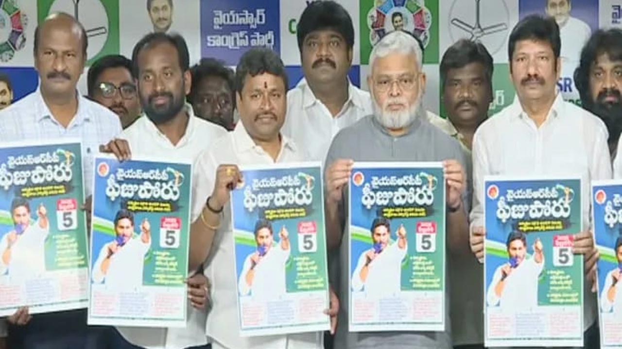 కూటమి ప్రభుత్వం విద్యార్థులను మోసం చేసిందని.. వైఎస్ఆర్ కాంగ్రెస్పార్టీ ఆరోపించింది. తాము విద్యార్థులకు అండగా నిలుస్తామని స్పష్టం చేసింది. ఈ క్రమంలోనే ఫిబ్రవరి 5వ తేదీన ‘ఫీజు పోరు’ పేరుతో ఉద్యమానికి రెడీ అవుతోంది. ఈ కార్యక్రమానికి సంబంధించిన పోస్టర్ను ఆ పార్టీ నేతలు తాజాగా విడుదల చేశారు. తాడేపల్లిలోని పార్టీ కేంద్ర కార్యాలయంలో మాజీ మంత్రులు అంబటి రాంబాబు. జోగి రమేష్, వెల్లంపల్లి శ్రీనివాస్ ఈ వాల్ పోస్టర్ను విడుదల చేశారు. ఫీజు పోరు ఉద్యమ కార్యక్రమంలో భాగంగా.. ఫిబ్రవరి 5వ తేదీన ఆంధ్రప్రదేశ్ రాష్ట్ర వ్యాప్తంగా ప్రతి జిల్లా కేంద్రంలో.. విద్యార్ధులు, పేరెంట్స్తో కలిసి వైసీపీ నేతలు, విద్యార్థి సంఘాల ప్రతినిధులు కలెక్టర్లకు డిమాండ్ పత్రాలు ఇవ్వనున్నారు.